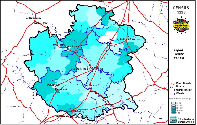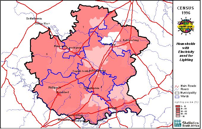 | Ward | Households | Formal Dwellings(%) | Telephone at Home(%) | Electricity(%) | Sanitation(%) | Piped Water to Dwelling(%) |