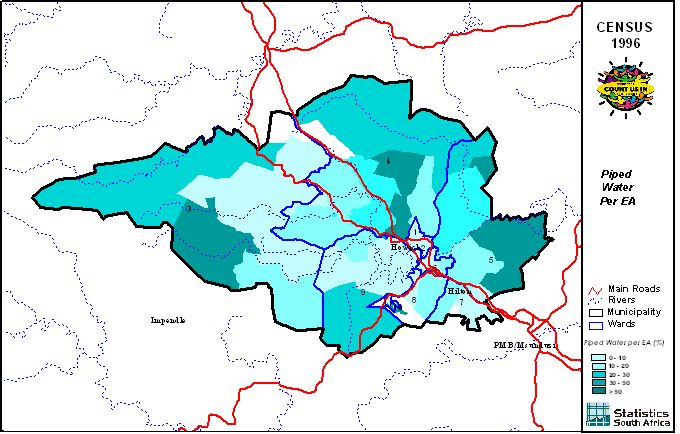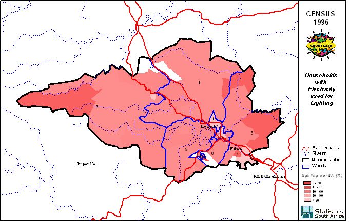 | Ward | Households | Formal Dwellings(%) | Telephone at Home(%) | Electricity(%) | Sanitation(%) | Piped Water to Dwelling(%) |