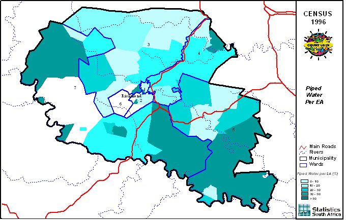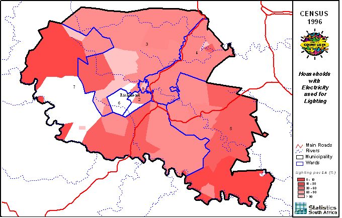 | Ward | Households | Formal Dwellings(%) | Telephone at Home(%) | Electricity(%) | Sanitation(%) | Piped Water to Dwelling(%) |
