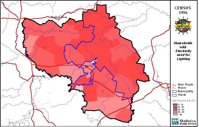 | Ward | Households | Formal Dwellings(%) | Telephone at Home(%) | Electricity(%) | Sanitation(%) | Piped Water to Dwelling(%) |