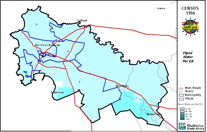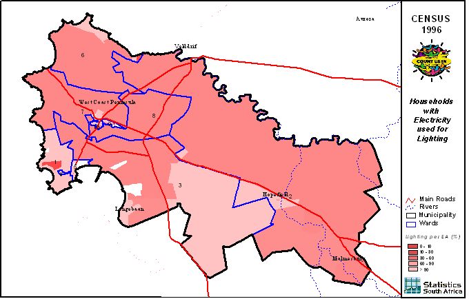 | Ward | Households | Formal Dwellings(%) | Telephone at Home(%) | Electricity(%) | Sanitation(%) | Piped Water to Dwelling(%) |
