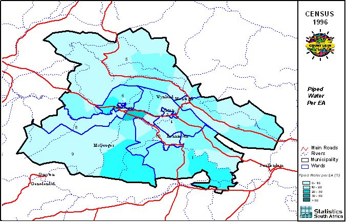 | Ward | Households | Formal Dwellings(%) | Telephone at Home(%) | Electricity(%) | Sanitation(%) | Piped Water to Dwelling(%) |