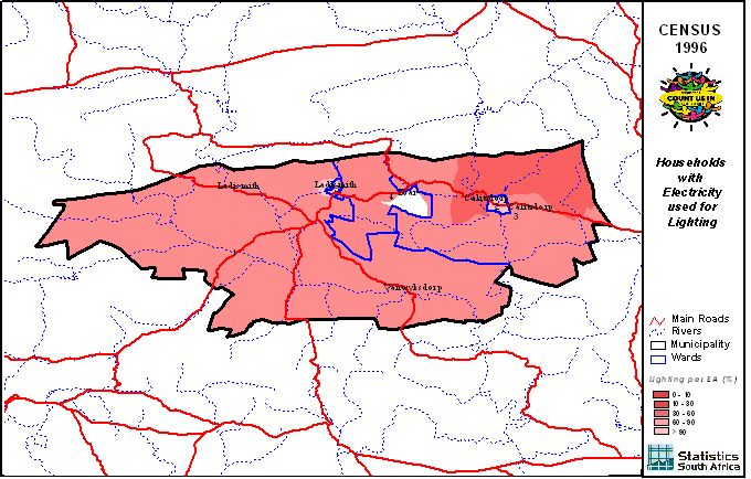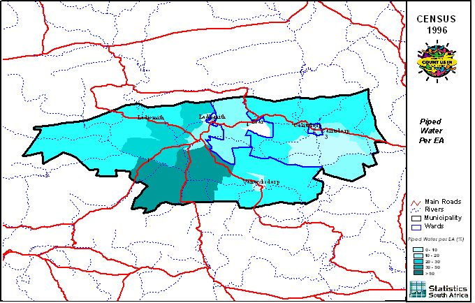 | Ward | Households | Formal Dwellings(%) | Telephone at Home(%) | Electricity(%) | Sanitation(%) | Piped Water to Dwelling(%) |