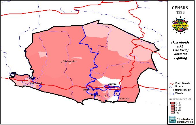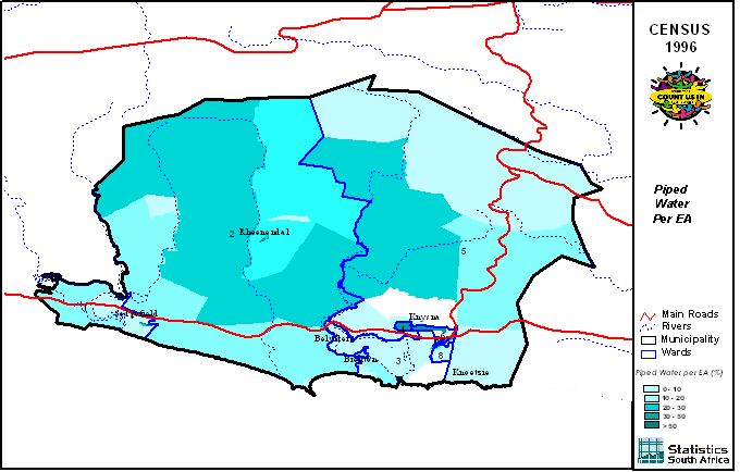 | Ward | Households | Formal Dwellings(%) | Telephone at Home(%) | Electricity(%) | Sanitation(%) | Piped Water to Dwelling(%) |