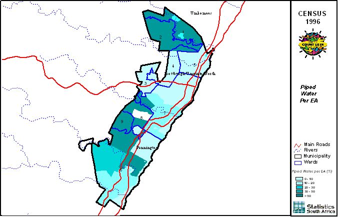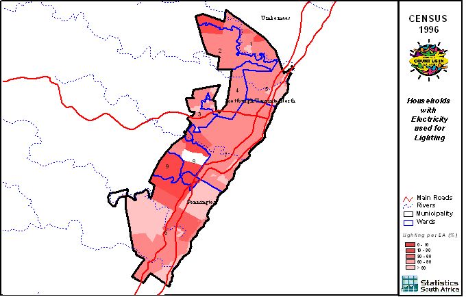 | Ward | Households | Formal Dwellings(%) | Telephone at Home(%) | Electricity(%) | Sanitation(%) | Piped Water to Dwelling(%) |