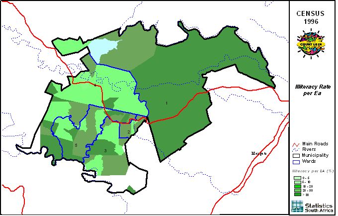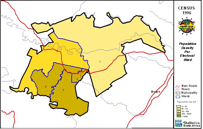 | Ward | Population | African | Coloured | Indian | White | Other | Male | Female | Unmarried | Married | Illiterate |