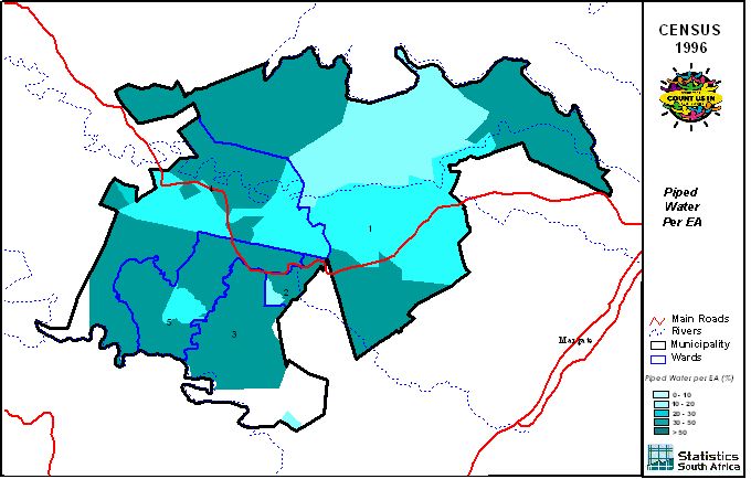 | Ward | Households | Formal Dwellings(%) | Telephone at Home(%) | Electricity(%) | Sanitation(%) | Piped Water to Dwelling(%) |