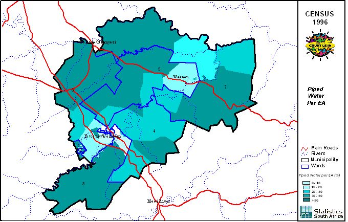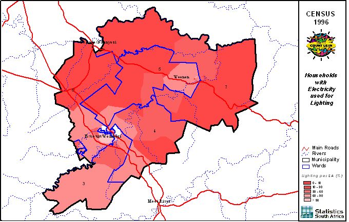 | Ward | Households | Formal Dwellings(%) | Telephone at Home(%) | Electricity(%) | Sanitation(%) | Piped Water to Dwelling(%) |