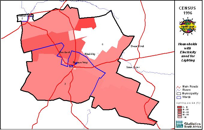 | Ward | Households | Formal Dwellings(%) | Telephone at Home(%) | Electricity(%) | Sanitation(%) | Piped Water to Dwelling(%) |