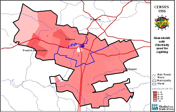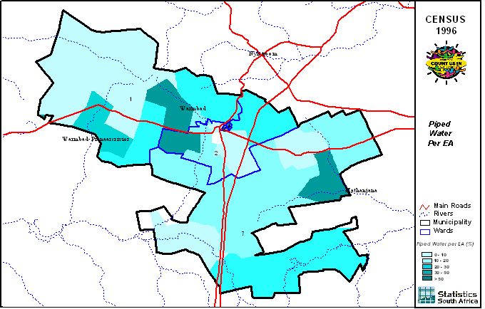 | Ward | Households | Formal Dwellings(%) | Telephone at Home(%) | Electricity(%) | Sanitation(%) | Piped Water to Dwelling(%) |
