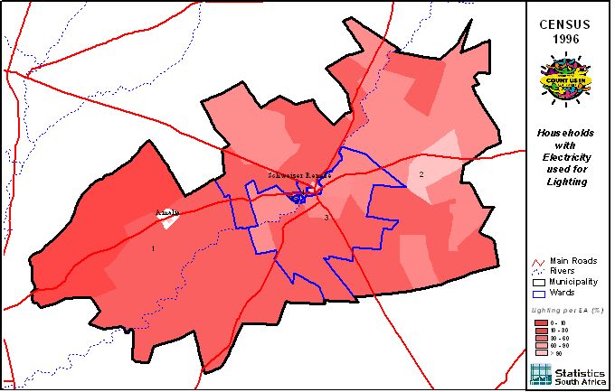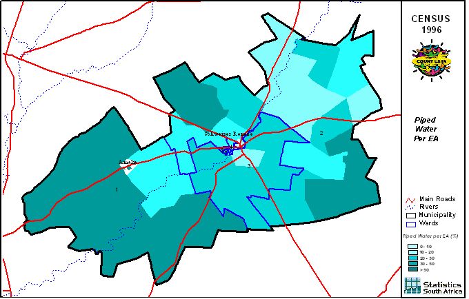 | Ward | Households | Formal Dwellings(%) | Telephone at Home(%) | Electricity(%) | Sanitation(%) | Piped Water to Dwelling(%) |