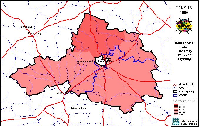 | Ward | Households | Formal Dwellings(%) | Telephone at Home(%) | Electricity(%) | Sanitation(%) | Piped Water to Dwelling(%) |
