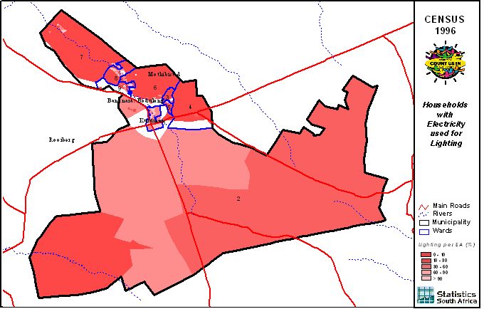 | Ward | Households | Formal Dwellings(%) | Telephone at Home(%) | Electricity(%) | Sanitation(%) | Piped Water to Dwelling(%) |