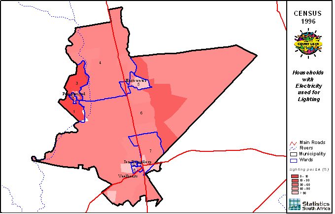 | Ward | Households | Formal Dwellings(%) | Telephone at Home(%) | Electricity(%) | Sanitation(%) | Piped Water to Dwelling(%) |