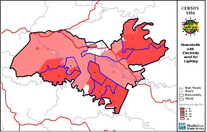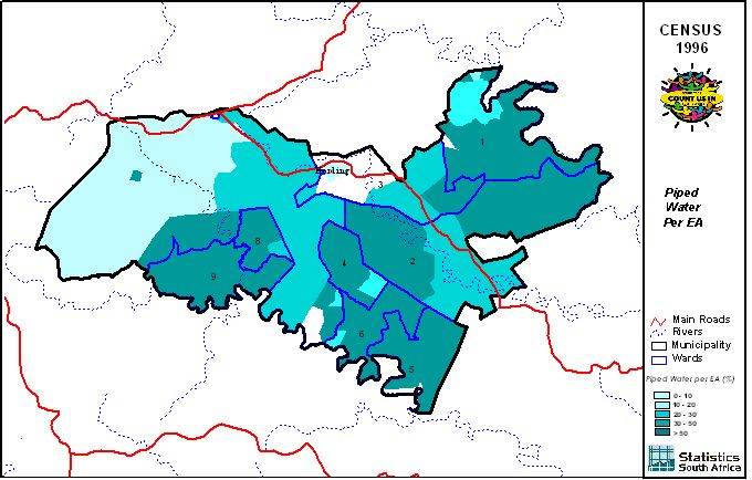 | Ward | Households | Formal Dwellings(%) | Telephone at Home(%) | Electricity(%) | Sanitation(%) | Piped Water to Dwelling(%) |
