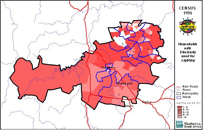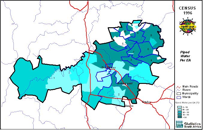 | Ward | Households | Formal Dwellings(%) | Telephone at Home(%) | Electricity(%) | Sanitation(%) | Piped Water to Dwelling(%) |