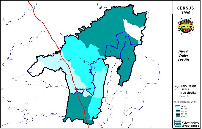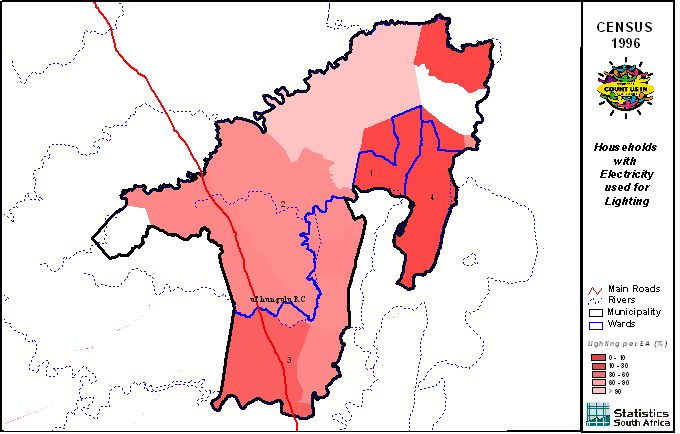 | Ward | Households | Formal Dwellings(%) | Telephone at Home(%) | Electricity(%) | Sanitation(%) | Piped Water to Dwelling(%) |
