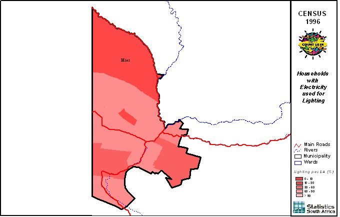 | Ward | Households | Formal Dwellings(%) | Telephone at Home(%) | Electricity(%) | Sanitation(%) | Piped Water to Dwelling(%) |