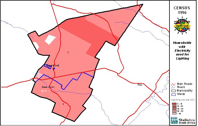 | Ward | Households | Formal Dwellings(%) | Telephone at Home(%) | Electricity(%) | Sanitation(%) | Piped Water to Dwelling(%) |