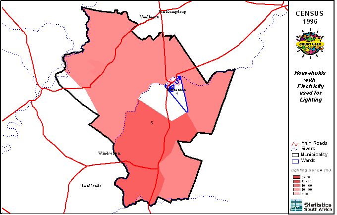 | Ward | Households | Formal Dwellings(%) | Telephone at Home(%) | Electricity(%) | Sanitation(%) | Piped Water to Dwelling(%) |