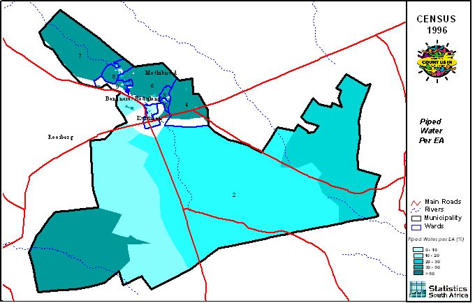 | Ward | Households | Formal Dwellings(%) | Telephone at Home(%) | Electricity(%) | Sanitation(%) | Piped Water to Dwelling(%) |