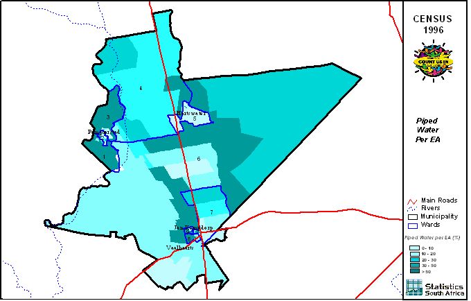 | Ward | Households | Formal Dwellings(%) | Telephone at Home(%) | Electricity(%) | Sanitation(%) | Piped Water to Dwelling(%) |