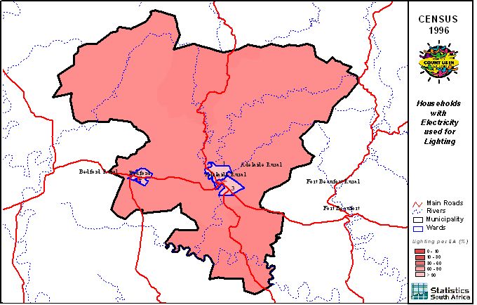 | Ward | Households | Formal Dwellings(%) | Telephone at Home(%) | Electricity(%) | Sanitation(%) | Piped Water to Dwelling(%) |