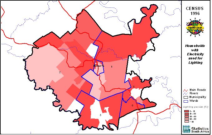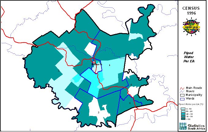 | Ward | Households | Formal Dwellings(%) | Telephone at Home(%) | Electricity(%) | Sanitation(%) | Piped Water to Dwelling(%) |