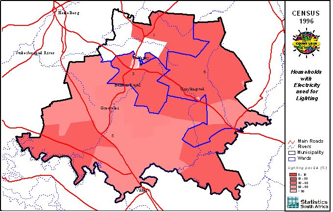 | Ward | Households | Formal Dwellings(%) | Telephone at Home(%) | Electricity(%) | Sanitation(%) | Piped Water to Dwelling(%) |