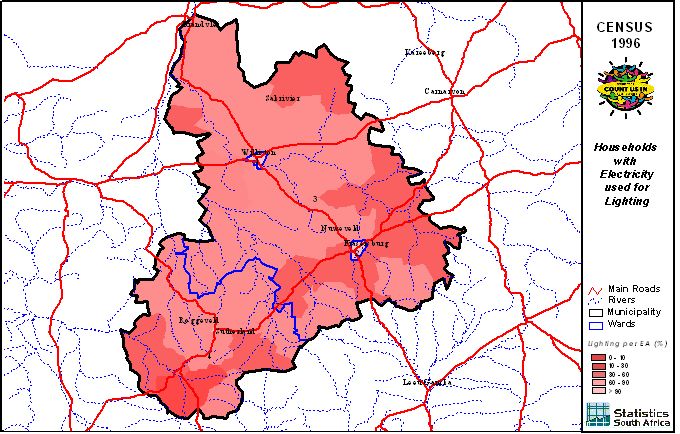 | Ward | Households | Formal Dwellings(%) | Telephone at Home(%) | Electricity(%) | Sanitation(%) | Piped Water to Dwelling(%) |