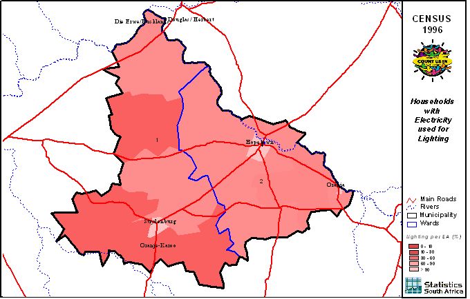 | Ward | Households | Formal Dwellings(%) | Telephone at Home(%) | Electricity(%) | Sanitation(%) | Piped Water to Dwelling(%) |