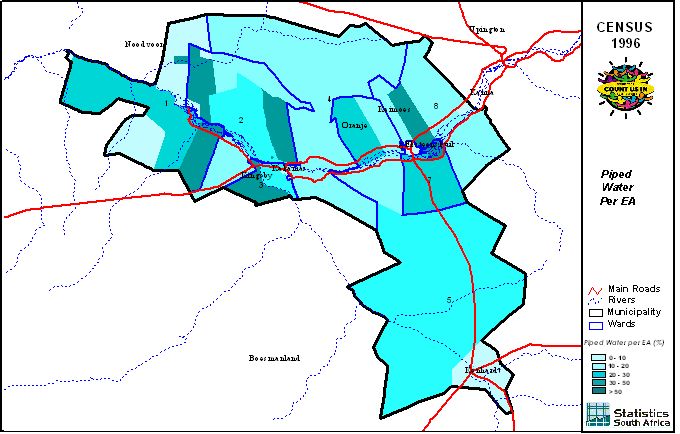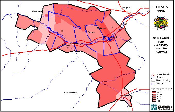 | Ward | Households | Formal Dwellings(%) | Telephone at Home(%) | Electricity(%) | Sanitation(%) | Piped Water to Dwelling(%) |
