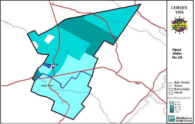 | Ward | Households | Formal Dwellings(%) | Telephone at Home(%) | Electricity(%) | Sanitation(%) | Piped Water to Dwelling(%) |