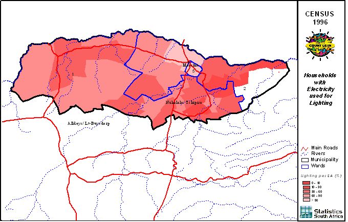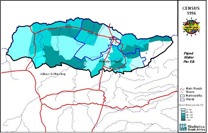 | Ward | Households | Formal Dwellings(%) | Telephone at Home(%) | Electricity(%) | Sanitation(%) | Piped Water to Dwelling(%) |