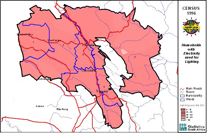 | Ward | Households | Formal Dwellings(%) | Telephone at Home(%) | Electricity(%) | Sanitation(%) | Piped Water to Dwelling(%) |