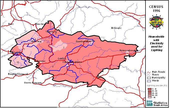 | Ward | Households | Formal Dwellings(%) | Telephone at Home(%) | Electricity(%) | Sanitation(%) | Piped Water to Dwelling(%) |